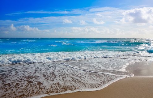 Lying on a long, white beach with palm trees, bathing in the turquoise sea with...